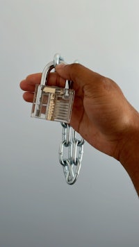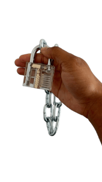The HARDWARE™ Clear Lock Chain is proof that transparency is everything. Featuring a transparent 3-inch statement lock which allows you to see how the moving parts work, You actually can see the pins moving up and down as the hook pick slides into and out of the lock cylinder.